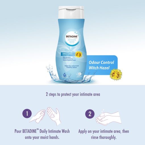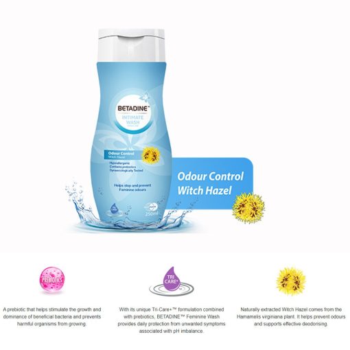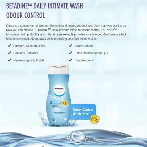 Betadine Daily Use Feminine Intimate Wash, Odour Control Witch Hazel is exclusively designed to help relieves undesirable feminine odours whilst protecting sensitive intimate skin. Its unique pH balanced TriCare ™ formulation with prebiotics and natural Witch Hazel extracts provides advanced deodorizing effect to keep unwanted odours at bay. An imbalance in healthy intimate flora can result in a variety of symptoms, such as itching, odour and irritation. Therefore it is important to maintain hygiene in your intimate zone. However, perfumed soap can disrupt the natural pH levels in the intimate area. Formulated with natural ingredients, Betadine Daily Use Feminine Intimate Wash contains a unique Tri-care formulation with prebiotics that helps stimulate the growth and dominance of beneficial bacteria and prevents harmful organisms from growing. Naturally extracted Witch Hazel from the Hamamelis virginiana plant helps prevent odours and supports effective deodorising. Thus, Betadine Intimate Cleanser range allows you to stay fresh and free of discomfort daily rather than heavily fragranced soaps and shower gels, providing everyday protection of the intimate feminine area.