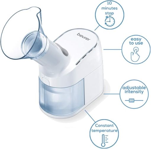 Survive the cold season with Beurer! The ultra-quiet SI 40 inhalation device by Beurer impresses with its effective application. Liquids such as saline solutions and essential oils can be safely vaporised by the Steam Vaporizer and colds don’t stand a chance! Soothing treatment during the cold season Includes flexible universal mask for the mouth and nose Steam setting can be varied for individual treatments Effective application due to constant temperature Short inhalation time Simple one-button operation Mains operation.