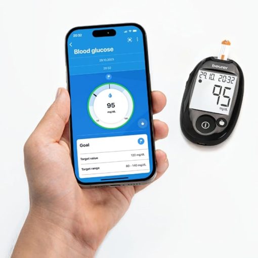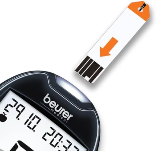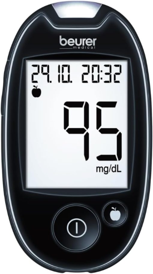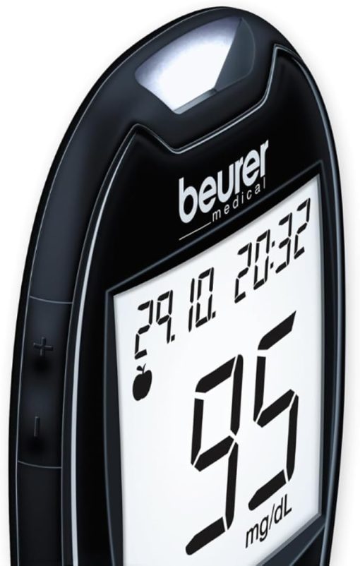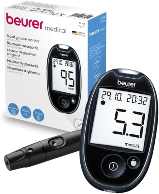 - User-Friendly Design: The Beurer GL 44 is designed for easy self-use, featuring an illuminated import shaft, XXL display, and extra-wide test strips for quick and accurate blood glucose measurements.