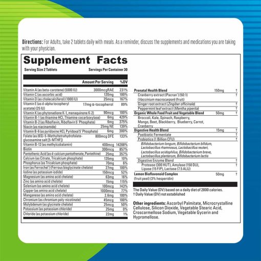 - Contains organic whole food fruit and vegetable blend 50mg