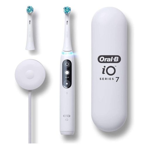 Braun Oral B iO™ Series 7 Electric Toothbrush White Alabaster combines the unique round brush head from Oral-B with gentle micro-vibrations for a fresh, clean-mouth feel and 100% healthier gums in one week. Interactive Display signals important information including brushing modes and head replacement reminder, greets you as you power up and gives you a smile for a job well done. Series 7 is Oral-B’s best clean ever with revolutionary magnetic iO™ technology for a professional clean feeling and gentle brushing experience.