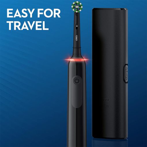 Braun Oral B Pro 3000 Rechargeable Toothbrush D505 Black uses three-dimensional technology to give you clean teeth, healthy gums, and a whiter smile. The sleek handle of the 3000 electric toothbrush helps you brush like your dentist recommends. It helps you brush for 2 minutes with the professional timer and it notifies you every 30 seconds to change the area you are brushing. While you are just moving the brush around your mouth, Oral-B’s distinct round head does all the rest. It removes up to 100 percent more plaque than a standard manual toothbrush for healthier gums and it starts making your smile whiter as of the first day of brushing by removing surface stains. Not only this, but the toothbrush helps you protect your delicate gums with the proprietary pressure control technology that reduces brushing speed and alerts you to be gentler if you brush too hard. It is used by dentist professionals and approved by the Oral Health Foundation.