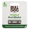 - To use Bulldog Skincare Original Steel Blade: First prepare the skin for shaving by exfoliating the skin. This removes dead and dry skin and helps to lift the stubble from the skin. It’s recommend using Bulldog’s Original Face Scrub for men. Wet face with warm water. Squeeze a 10p size amount of Original Foaming Shave Gel onto clean fingers and massage into your stubble. Shave the skin going with the grain with a clean, sharp blade. Rinse off with warm water and pat the skin dry with a towel. Follow with Original Aftershave Balm, designed to soothe and moisturize the skin after shaving.