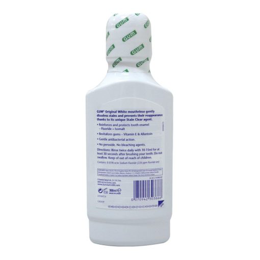 Butler Gum Original White Mouthrinse has the unique Stain Clear agent that gently removes stains from tooth surfaces (including the hard-to-reach interdental spaces and microscopic crevices of tooth enamel) and delivers a protective coating to prevent stain adhesion and accumulation.