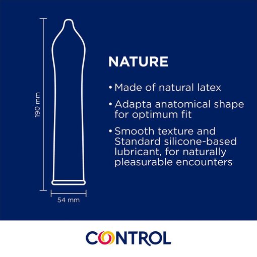 Control Nature condoms are the ideal choice for anyone who wants to experience pleasure safely, but without sacrificing on spontaneity and natural feeling. Transparent with a smooth surface, they guarantee a perfect fit and maximum comfort thanks to the exclusive Adapta anatomical shape. Suitable for use with water-based gels and lubricants, these condoms are perfect for naturally pleasurable encounters.