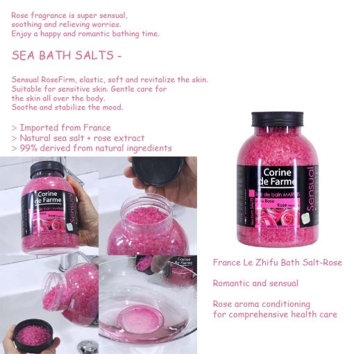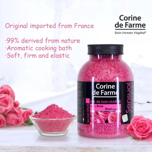 Corine De Farme Sea Bath Salt Rose dissolve quickly in the bath and guarantee a moment of total well-being for your body and mind. It helps to indulge yourself with a moment of peace and total relaxation. These relaxing bath sea salts with rose wrap the body in a relaxing and calming hug.
