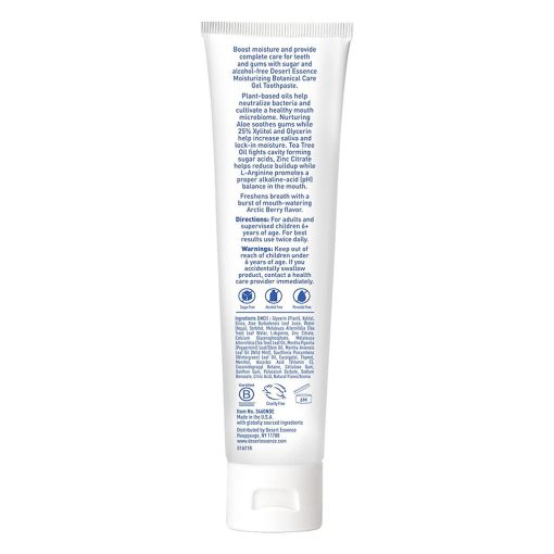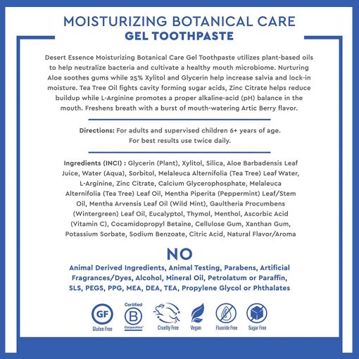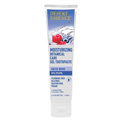 Desert Essence Moisturizing Botanical Care Fluoride-Free Gel Toothpaste is a plant-based gel toothpaste is specially formulated with 25% Xylitol to increase moisture while providing complete care of your teeth and gums. The plant based oil present in this formula helps to neutralize bacteria and cultivate a healthy mouth microbiome. Pure Australian Tea Tree Oil, known for its antiseptic qualities, helps fights cavity forming sugar acids while L-Arginine promotes a proper alkaline acid (pH) balance in your mouth. In addition, Zinc Citrate helps reduce buildup. Nurturing Aloe helps soothe gums and Arctic Berry freshens the breath with a burst of mouth-watering flavor. The formula doesn’t contain animal derived ingredients, animal testing, parabens, artificial fragrances/dyes, alcohol, mineral oil, petrolatum or paraffin, SLS, PEGS, PPG, MEA, DEA, TEA, propylene glycol or phthalates. This vegan gel toothpaste is a perfect addition to your daily oral hygiene kit. Boost moisture in your mouth with every brush!
