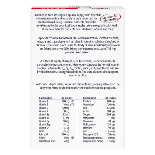 Doppelherz® aktiv Vitamin and Mineral Depot Tablets for men contains carefully selected vitamins, minerals and trace elements from vitamin A to zinc, which are involved in numerous metabolic processes in the body of men. Additionally contained are 200 mg coenzyme Q10, 50 mg pomegranate extract and 135 mg pumpkin seed extract. For men in each life stage an optimal supply with essential vitamins, minerals and trace elements is important for health and well-being. Essential nutrients cannot be synthesized by the body itself and must be taken in regularly with food. The requirement for nutrients differs between women and men. A sufficient supply of magnesium, B-vitamins, selenium and zinc is particularly important for men. Magnesium supports the normal muscle function. Vitamins B1, B2, B6, B12, biotin, niacin, and pantothenic acid are involved in normal energy metabolism. The trace element zinc supports normal fertility. With only 1 depot tablet, important nutrients are gradually released in the body over many hours and nourish the bodies metabolic processes.
