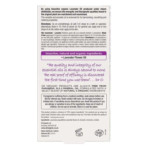 Dr.Organic Lavender Pure Oil is made from lavender flower (Lavandula Angustifolia) which has the ability to calm, balance and invigorate, helping to revitalize the skin. It’s a wonderful natural deodorizer and it also nourishes and fortifies hair, helping to leave it in perfect condition. This formula contains a minimum of 70% of organic ingredients and is made with bioactive, natural ingredients.