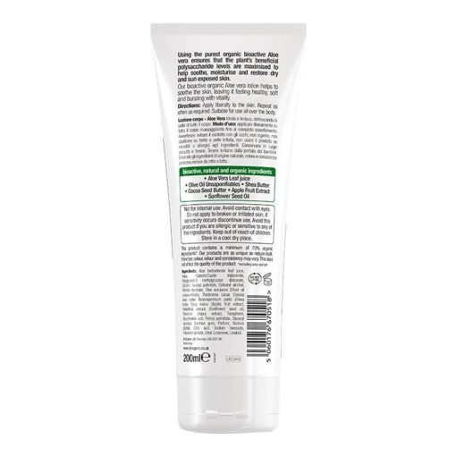 Dr.Organic Organic Aloe Vera Skin Lotion helps to soothe the skin, leaving it feeling healthy, soft and bursting with vitality. Using the purest organic bioactive Aloe vera juice ensures that the plant’s beneficial properties are maximized to help soothe, moisturize and restore dry and sun exposed skin. This product contains a minimum of 70% organic ingredients. It is enriched with Olive Oil Unsaponifiables, Shea Butter, Cocoa seed butter, Sunflower seed oil, Apple Fruit Extract.