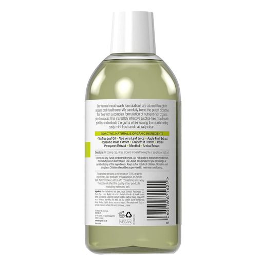 Dr Organic Tea Tree Mouthwash formulations are a breakthrough in organic oral healthcare. It is made by carefully blend the purest bioactive tea tree with a complex formulation of nutrient-rich organic plant extracts. The formulation includes arnica, aloe vera & grape seed extracts. This incredibly effective alcohol-free mouthwash purifies and refreshes the gums while leaving the mouth feeling zesty mint fresh and naturally clean.