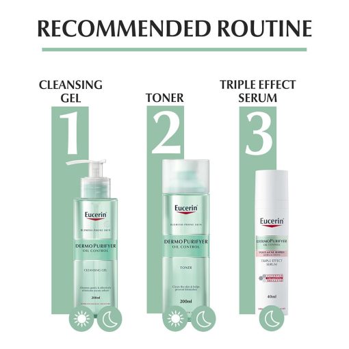 - Use the Eucerin Dermo Purifyer cleansing gel as a first step in your skin care routine – preferably twice daily: morning and evening