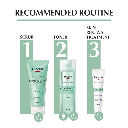 - Use the Eucerin Dermo Purifyer Oil Control Scrub once a week, or more frequently if needed, instead of the Cleansing Gel