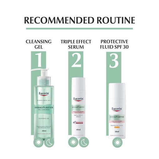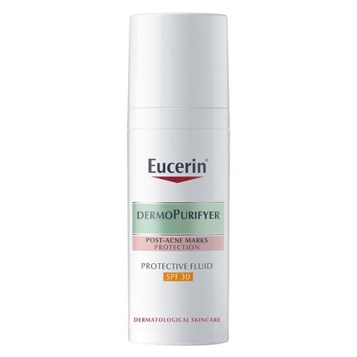 - Thoroughly cleanse skin before use. Apply one full pump of Eucerin Dermo Purifyer Post Blemish Anti-Mark SPF 30 Protective Fluid thoroughly all over your face and avoid eye area. Use in the morning or as often as needed. Use in combination with Eucerin DermoPure Triple Effect Serum for enhanced efficacy