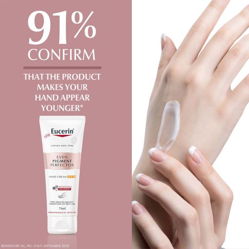 Eucerin Even Pigment Perfector SPF 30 Anti-Pigment Hand Cream developed to help reduce pigment spots in the skin to reveal beautiful hands with even and radiant skin. It is incorporated with Thiamidol to reduce the appearance of pigment spots and prevent reappearance with regular usage. Thiamidol, an effective and patented ingredient that acts at the root cause of hyperpigmentation by reducing melanin production. It is clinically and dermatologically proven to reduce dark spots and prevent their re-appearance. This hand cream is not only proven to reduce dark spots but also prevent their reappearance. With regular use, see visible results after two weeks and witness further improvement in the skin over time. The formula containing Hyaluronic Acid easily absorbs in the skin to provide and retain moisture all day long, keeping hands well hydrated and nourished. Hand cream absorbs quickly and moisturizes for 24 hours. SPF 30 provides additional protection from future sun-induced age spots. With UVA and UVB filters (SPF 30) the correcting hand cream offers effective protection from the sun and reduces the chances of skin developing sun-induced pigment spots. Pigment spots on the hands are visibly reduced and skin appears even and radiant with regular use. Even Pigment Perfector range has been specially formulated with our patented ingredient, Thiamidol, to effectively reduce hyperpigmentation for more even and radiant skin. Beauty doesn’t have to be complicated. It just needs to work. After all, your skin is the body’s largest organ and it deserves good care, too. That’s why Eucerin is trusted by dermatologists, recommended by pharmacists-and loved by consumers worldwide as the brand that delivers healthy, beautiful skin for everyone. Discover the life-changing power of Eucerin’s dermatological skincare products, from moisturizers and sunscreens to footcare products and more.