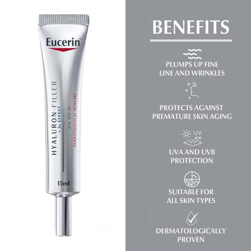 Eucerin Hyaluron-Filler Anti-Wrinkle Eye Cream has been specially made to protect against premature skin ageing and target ‘crow’s feet’ wrinkling in the delicate eye area. The formula with a combination of high and low molecular Hyaluronic Acid works on both existing and emerging wrinkles and additionally contains bio-active Glycine Saponin the most effective substance to naturally and visibly reduce the appearance of fine lines and wrinkles. SPF 15 plus UVA protection reduces premature ageing and the deepening of eye area wrinkles to leave the skin looking smoother and more youthful. This clinically proven anti-ageing eye cream to target and treat eye wrinkles. With regular use, this eye cream helps to restore lost volume and firm the skin around the eyes for a lifting effect for a smooth, more youthful look. Beauty doesn’t have to be complicated. It just needs to work. After all, your skin is the body’s largest organ and it deserves good care, too. That’s why Eucerin is trusted by dermatologists, recommended by pharmacists-and loved by consumers worldwide as the brand that delivers healthy, beautiful skin for everyone. Discover the life-changing power of Eucerin’s dermatological skincare products, from moisturizers and sunscreens to footcare products and more.