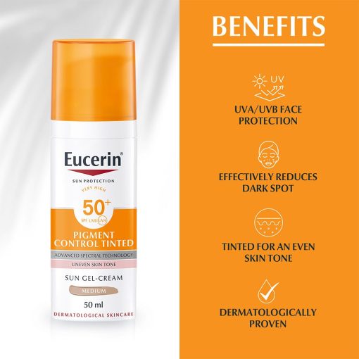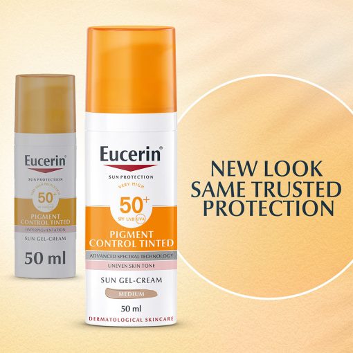 - Apply Eucerin Sun Pigment Control Medium Tinted Gel-Cream generously on face before sun exposure and reapply frequently especially after swimming, perspiring or toweling to maintain the original protection