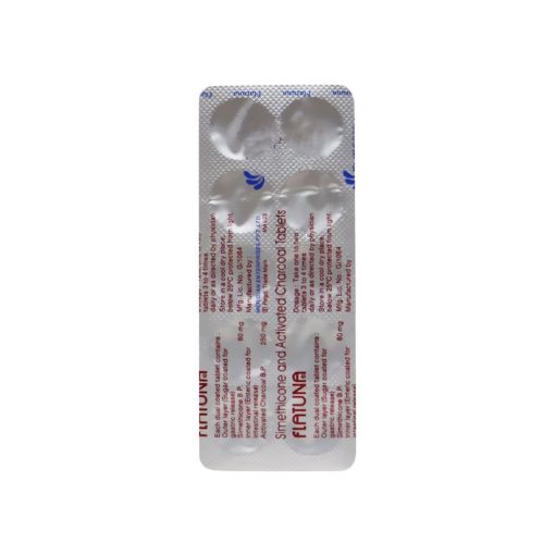 Flatuna Tablets are composed of an outer layer of Simethicone 80 mg for gastric release and an inner layer of Charcoal 250 mg for intestinal release. The Simethicone is released in the gastric environment, where it acts by decreasing the surface tension of gas bubbles, thus facilitating their coalescence and expulsion as flatus or belching. The inner layer of activated charcoal is released in the intestinal environment. Activated charcoal being very porous, displays amazing absorption properties. As a result the excess gas sticks to the charcoal tablet, thereby giving immediate relief from bloating.