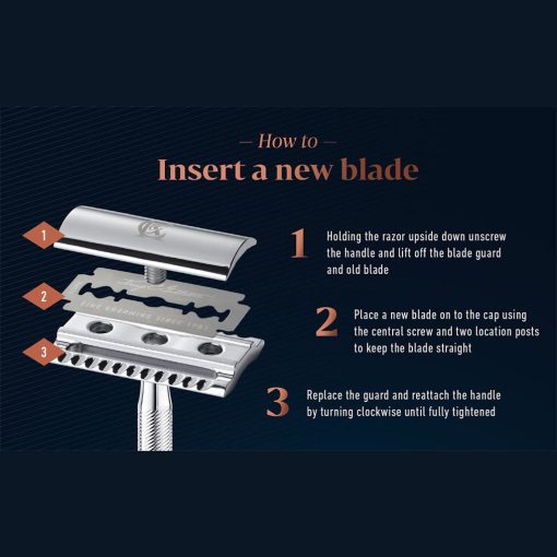 - To insert a new blade: Holding the razor upside down unscrew the handle and lift off the blade guard and old blade. Place a new blade on to the cap using the central screw and 2 location posts to keep the blade straight. Replace the guard and reattach the handle by turning clockwise until fully tightened.