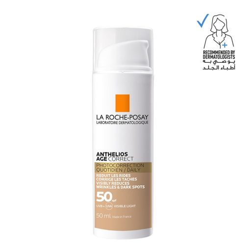 - Apply the La Roche Posay Anthelios Age Correct SPF50 Tinted Sunscreen just before exposure. Re-apply frequently and generously to maintain protection, especially after perspiring or toweling. External use.