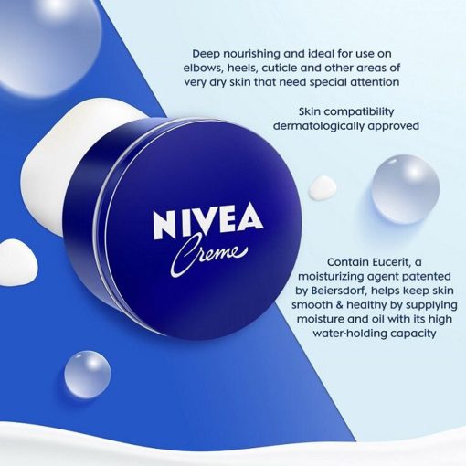 Nivea Cream is a thick and rich formula with the Skin related Eucerit, Panthenol and Glycerin which supports the skin’s regenerative qualities, and can have a soothing, calming effect on very dry skin and even small wounds. Nivea Cream revives the skin by bringing out its natural glow while delaying premature aging. It contains antioxidants that are beneficial for the skin. It not only adds natural radiance & glow but also soothes the skin. It helps repair sun damage caused by exposure to the harsh rays of the sun.