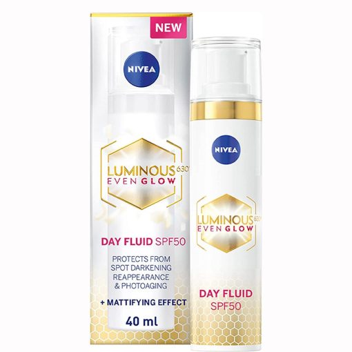 Nivea Luminous630 Even Glow Day Fluid SPF50 is combined with an extra protecting, yet lightweight formula, which is enriched with Hyaluronic acid, Vitamin E and UVA/UVB filters. It gives a mattifying effect. The appearance of spots is reduced. Helps reduce their reappearance Skin is protected from sun and ageing signs caused by sun exposure. Texture is improved, complexion is more even and illuminated.