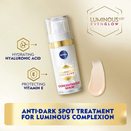 Nivea Luminous Even Glow Serum is a lightweight serum which reduces the appearance of spots caused by sun, ageing, pregnancy and menopause factors and helps reduce their reappearance to reveal the skin’s natural luminosity. It took Nivea scientists 10 years of meticulous research and the screening of 50,000 ingredients, to find the highly effective LUMINOUS630 ingredient, that works at cellular level.