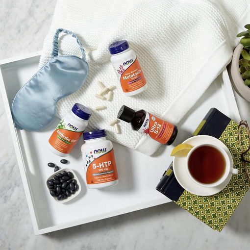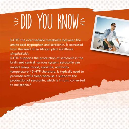 Now 5-HTP 100mg Vegetarian Capsules For Positive Mood & Neurotransmitter Support works by increasing synthesis of serotonin, a “feel good” neurotransmitter. 5-HTP, the intermediate metabolite between the amino acid L-tryptophan and serotonin, is extracted from the seed of an African plant (Griffonia simplicifolia). 5-HTP supports the production of serotonin in the brain and central nervous system; serotonin can impact sleep, mood, appetite, and body temperature. Low levels of the neurotransmitter serotonin are thought to contribute to a range of mental and physical health problems – such as depression, insomnia and obesity – so raising levels seems to be one way in which these issues can be managed. Since serotonin helps regulate mood and behavior, 5-HTP may have a positive effect on sleep, mood, anxiety, appetite, and pain sensation. 5-HTP is typically used to promote restful sleep because it supports the production of serotonin, which is in turn, converted to melatonin.