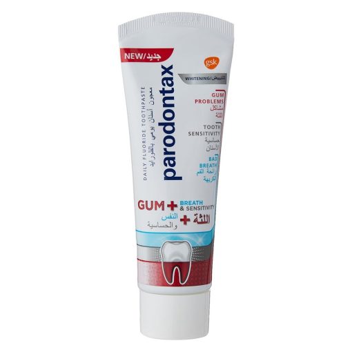 - Squeeze a pea-sized amount of Parodontax Gum + Breath & Sensitivity Whitening Toothpaste onto a soft-bristled toothbrush. Wet your toothbrush with water before applying the toothpaste. Brush your teeth thoroughly for at least two minutes. Make sure to cover all surfaces of your teeth, including the fronts, backs, and chewing surfaces. Pay special attention to your gum line. For best results, use Parodontax Gum + Breath & Sensitivity Original Toothpaste at least twice a day, preferably in the morning and before bedtime.