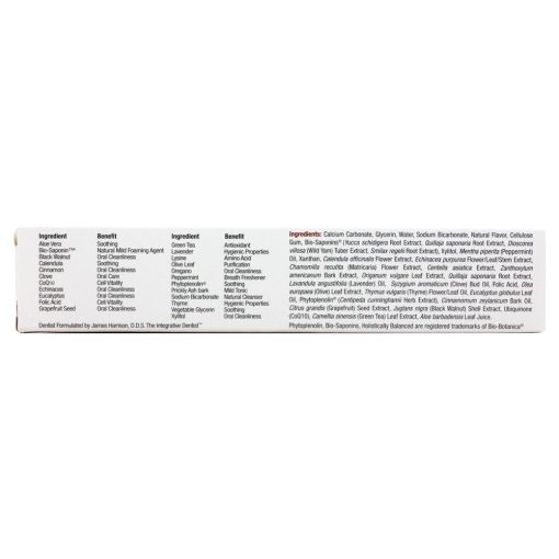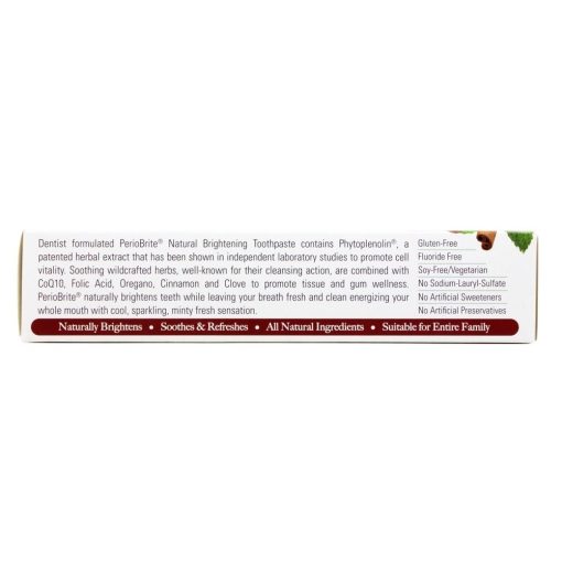 PerioBrite Cinnamint Toothpaste is a natural brightening toothpaste with CoQ10 and folic acid. Dentist formulated this toothpaste with Phytoplenolin, a patented herbal extract that has been shown in independent laboratory studies to promote cell vitality. Soothing wild crafted herbs, well-known for their cleansing action, are combined with CoQ10, folic acid, oregano, cinnamon and clove to promote tooth and gum wellness.