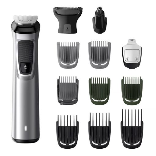 Philips Multigroom 7000 Series 13 In 1 Grooming Kit For Face Hair And Body is an all-in-one hair trimmer comes with 13 attachments to provide a full-body grooming solution. The pack contains metal trimmer, detail metal trimmer, nose and ear trimmer, body shaver, body skin protector attachment, 3-7mm beard adjustable comb, 2 stubble combs, 3 hair combs and 2 body combs. The narrow design of the steel precision groomer makes it easy to precisely edge and finish small details. It gives up to 120 minutes of cordless use from a single 1-hour charge. A quick 5-minute charge provides enough power for one full trim. It is designed to be water-resistant, so that you can use it comfortably in the shower and easily clean it under the tap. They come with a 2 year warranty, never need to be oiled and are compatible with any voltage worldwide.