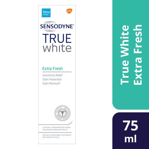 Sensodyne True White Extra Fresh has the lowest abrasion formulation ever in a Sensodyne toothpaste. With twice daily brushing it is clinically proven to relieve sensitivity pain and helps to restore the true color of your teeth. It leaves a protective layer to help prevent new stains forming.