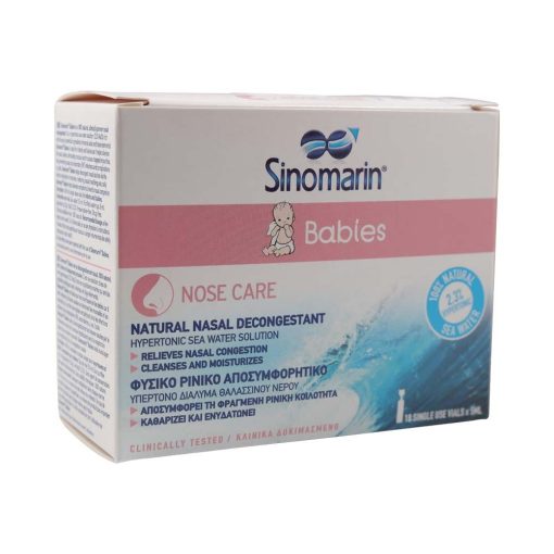 Sinomarin Babies monodose is a 100% natural and clinically proven nasal decongestant. It is a hypertonic sea water solution (2.3% NaCl) rich with the sea beneficial ingredients. Sinomarin Babies helps decongest nasal cavities via the natural mechanism of osmosis and restoring nasal breathing naturally.
