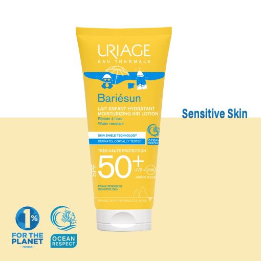 Uriage Bariesun SPF 50+ Moisturizing Lotion is indented to provide a very high level of sun protection and is recommended for use on children’s face and body skin. This sunscreen essentially has a high-performance filtering compound added to it that shields the skin from UVA and UVB radiation. In addition, even after spending all day at the beach or pool, the skin is shielded from free radicals and keeps its moisture longer. Because it contains neither alcohol nor fragrance, its formulation is gentle enough to use on skin that is sensitive. At the same time, it has a thin, non-greasy texture that absorbs swiftly into the skin, enabling them to resume their outdoor activities right away. The renowned moisturizer uriage thermal water has been included to the mix of this sunscreen as well. In essence, it defends the skin’s DNA from UV ray damage and strengthens the skin’s protective barrier to combat the sun’s detrimental effects. Additionally, because it contains Aquaspongines, this lotion offers strong protection against dryness. As a result, the skin is significantly smoother, softer, and more moisturized in addition to being completely protected from the sun. The presence of vitamin C and E guarantee extra protection to the skin thanks to the high concentration of antioxidants. Anti-UVA-UVB Filtering Complex with Tinosorb M guarantees proven photostability and broad UVB and UVA coverage. Overall, children’s skin receives complete sun protection, maintaining its moisture and smoothness all day long.