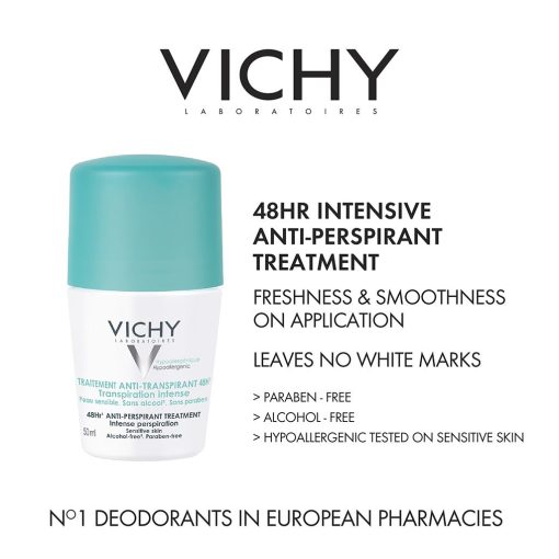 Vichy 48 Hours Anti Perspirant Deodorant Roll-On Intensive Treatment is enriched with aluminium salts which has a long-term anti-perspiration efficacy causing no discomfort to skin. The micro-refined anti-perspirant active ingredients mean increased targeting of sweat pores for protection for up to 48 hours. This long-lasting deodorant is enriched with Vichy’s mineralizing thermal water, offering 15 minerals to protect and comfort the underarm skin. Vichy 48Hr Intense Anti-Perspirant Treatment Roll-On is for women and men who suffer from intense perspiration and who want to combine a long-term anti-perspirant that is comfortable for their skin. Its extra strength formula deals with more intense underarm perspiration, and provides protection for up to 48 hours. Vichy Laboratories empower all women and men to maximize their skin and scalp health at every stage of life. Vichy believe that health is vital and that it starts with the skin. Vichy’s heart is connected to people, to their lives, to their skin. Vichy empowers all women and men, of all ages and phototypes to have a positive impact on their skin and scalp health, at every stage of their life. Discover Vichy’s full range of products & treatments online. Care for your skin with clinically tested and dermatologically recommended Vichy products.