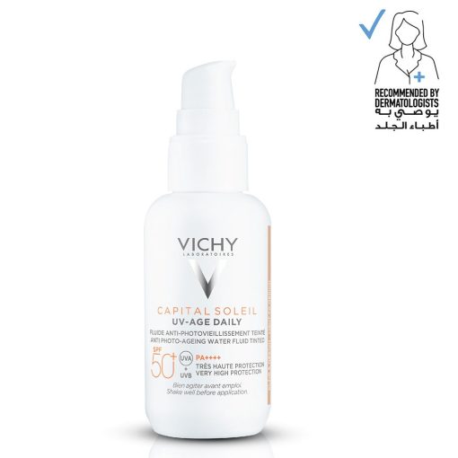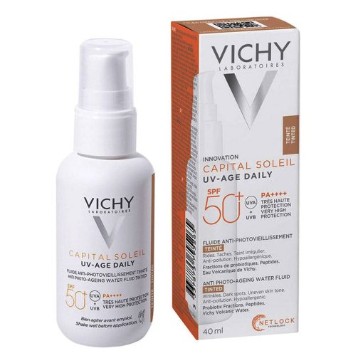 Vichy Capital Soleil UV – Age Tinted Anti Ageing Sunscreen SPF50+ is an advanced high protection facial Sunscreen with a water fluid texture that helps protect the skin from the damages of UV radiation and pollution whilst targeting existing signs of photo-ageing. Its formula delivers a light coverage to unify and enhance skin tone. The very high broad spectrum UVA and UVB sunscreen, enriched with powerful dermatological-actives: Peptides, Niacinamide and Vitamin E combined with multi-patented Netlock technology, protects the skin and helps to correct UV-induced wrinkles and dark spots, while strengthening the skin’s defense barrier function. Capital Soleil UV Age Daily SPF50+ is the essential final necessary step in your daily skincare routine, all year round. Its ultra-light, highly breathable texture provides an invisible, non-greasy skin-like finish, creating a perfect base for smooth make-up application. The lightweight, breathable texture combined with advanced suncare technology provides uniform invisible coverage, that leaves no white cast or tacky finish. Skin looks healthier, smoother and feels protected!.