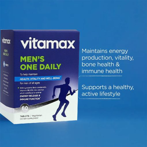 Vitamax Men’s One Daily Tablet is a multi-nutrient formula, specifically formulated to meet the unique needs of active men, providing the nourishment the body requires to maintain optimal health and overall well-being. It contains selected vitamins ,minerals and trace minerals to help maintain health and vitality. Whether you’re deep in training, finishing client reports, or just caught in traffic, the right nutrition can help you feel at your best in every moment. Vitamax Men’s One Daily Tablet helps maintain health and vitality with pantothenic acid which contributes to normal mental performance. It also includes B vitamins: thiamine (vit B1), B6 and B12 which contribute to normal energy release while zinc contributes to normal cognitive function. A healthy immune system is important for good health. Vitamin D and copper contribute to the normal function of the immune system. The formula also contains calcium, ensuring an adequate intake which is vital for men of all ages, as adequate consumption of calcium and trace elements, contribute to greater bone strength and optimal bone mineralisation. Anyone can struggle to maintain a consistently healthy and balanced diet due to their hectic schedules and busy lifestyles. With Vitamax Nutritional supplements, you can maintain a healthy balance of essential nutrients in a safe, quick, and convenient way.